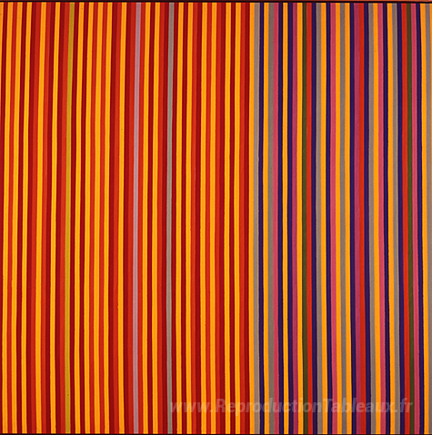 Nous vous proposons une reproduction artisanale sur toile du célèbre tableau 'Équinoxe' de Gene Davis, provenant du Musée de la Reproduction.