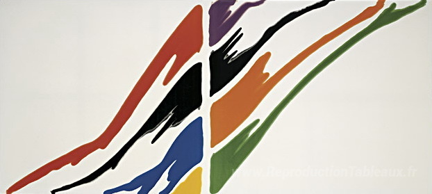 Nous vous proposons une reproduction artisanale sur toile du célèbre tableau 'Alpha Epsilon' de Morris Louis, provenant du Musée de la Reproduction.
