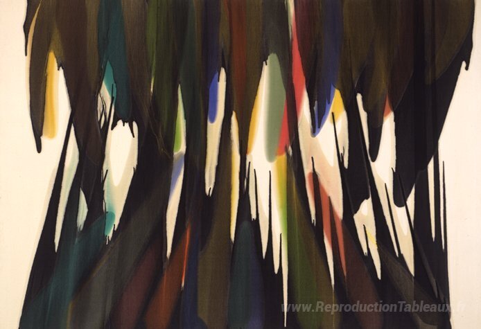 Nous vous proposons une reproduction artisanale sur toile du célèbre tableau 'Ambi I' de Morris Louis, provenant du Musée de la Reproduction.