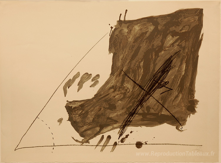 Nous vous proposons une reproduction artisanale sur toile du célèbre tableau 'Angolo et taches' de Antoni Tapies, provenant du Musée de la Reproduction.