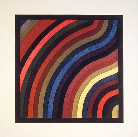Nous vous proposons une reproduction artisanale sur toile du célèbre tableau 'Bands ondulés de deux centimètres en couleurs' de Sol LeWitt, provenant du Musée de la Reproduction.