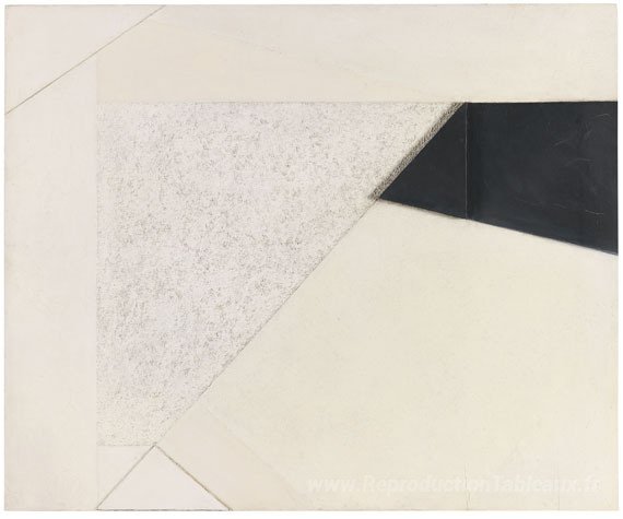 Nous vous proposons une reproduction artisanale sur toile du célèbre tableau 'Bild mit schwarzem Keil' de Carl Buchheister, provenant du Musée de la Reproduction.