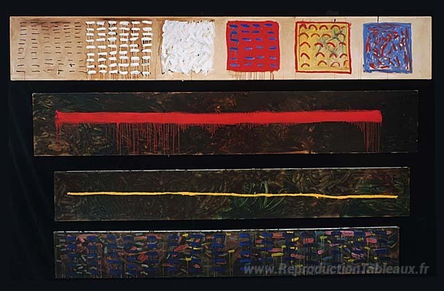 Nous vous proposons une reproduction artisanale sur toile du célèbre tableau 'Charge longue, grand graphique' de Pat Steir, provenant du Musée de la Reproduction.