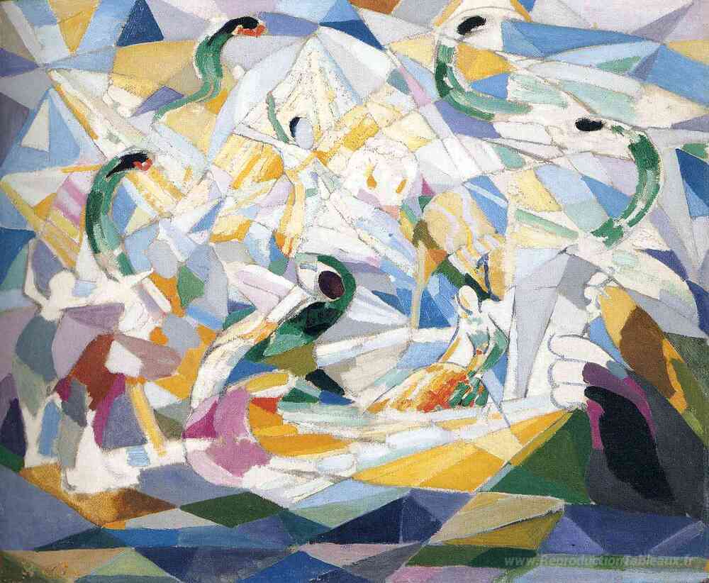 Nous vous proposons une reproduction artisanale sur toile du célèbre tableau 'Chevalier des roses' de Joseph Stella, provenant du Musée de la Reproduction.