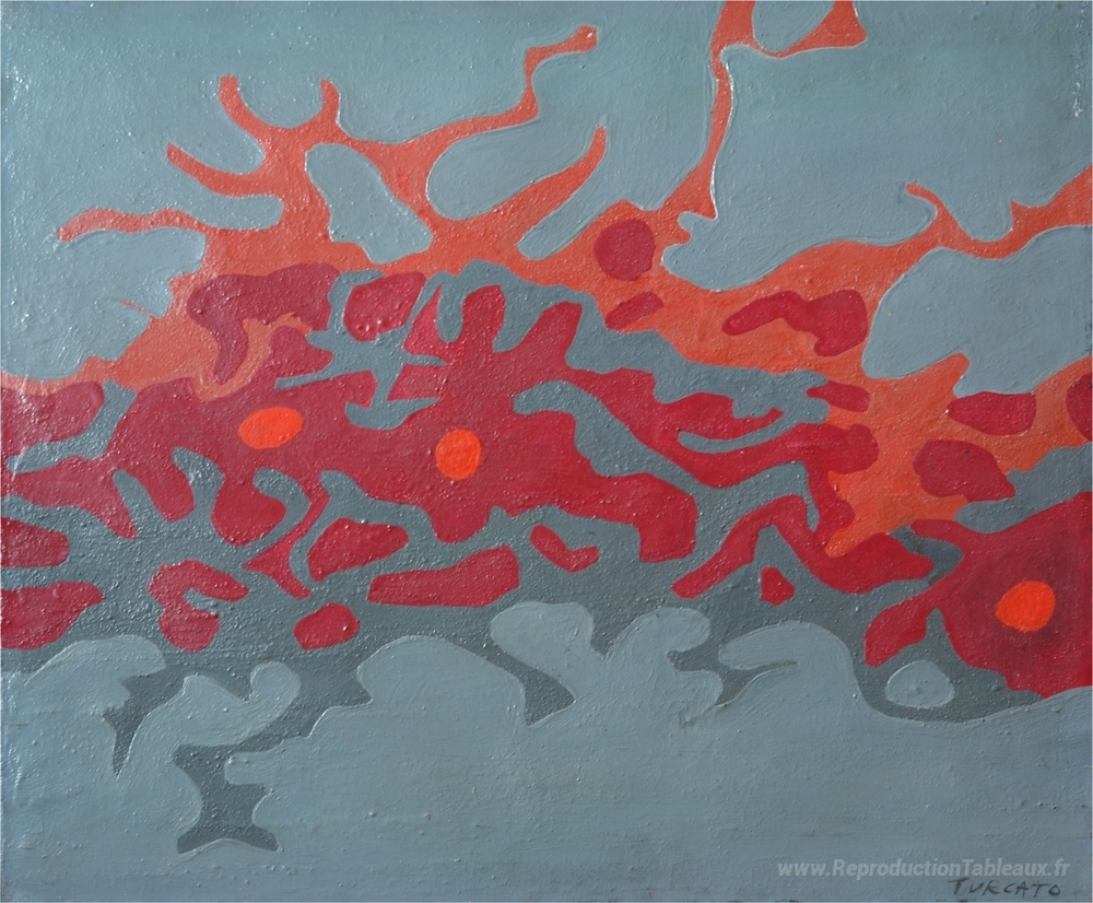 Nous vous proposons une reproduction artisanale sur toile du célèbre tableau 'Composiaine Grigio-Rosa' de Giulio Turcato, provenant du Musée de la Reproduction.