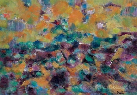Nous vous proposons une reproduction artisanale sur toile du célèbre tableau 'Composition abstraite' de Jean Le Moal, provenant du Musée de la Reproduction.