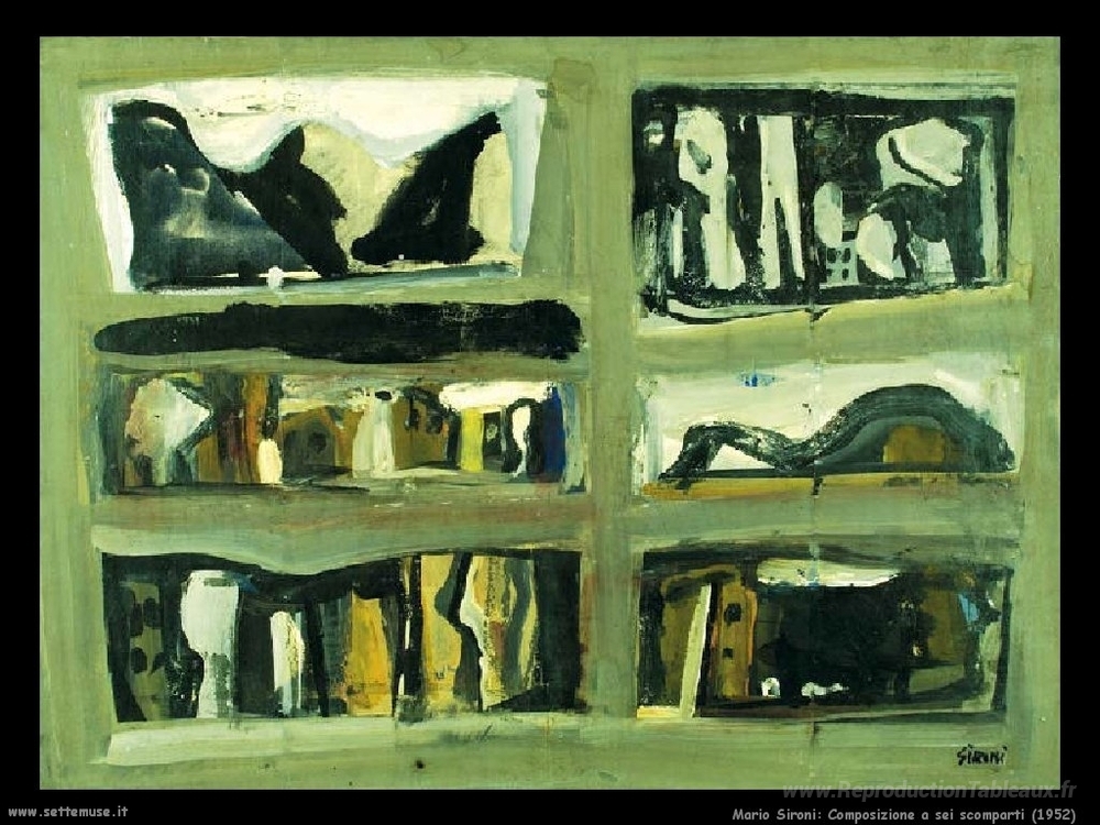 Nous vous proposons une reproduction artisanale sur toile du célèbre tableau 'Composition de six sections' de Mario Sironi, provenant du Musée de la Reproduction.