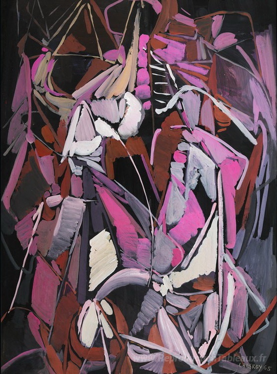 Nous vous proposons une reproduction artisanale sur toile du célèbre tableau 'Composition rose et parme chant noir' de Andre Lanskoy, provenant du Musée de la Reproduction.