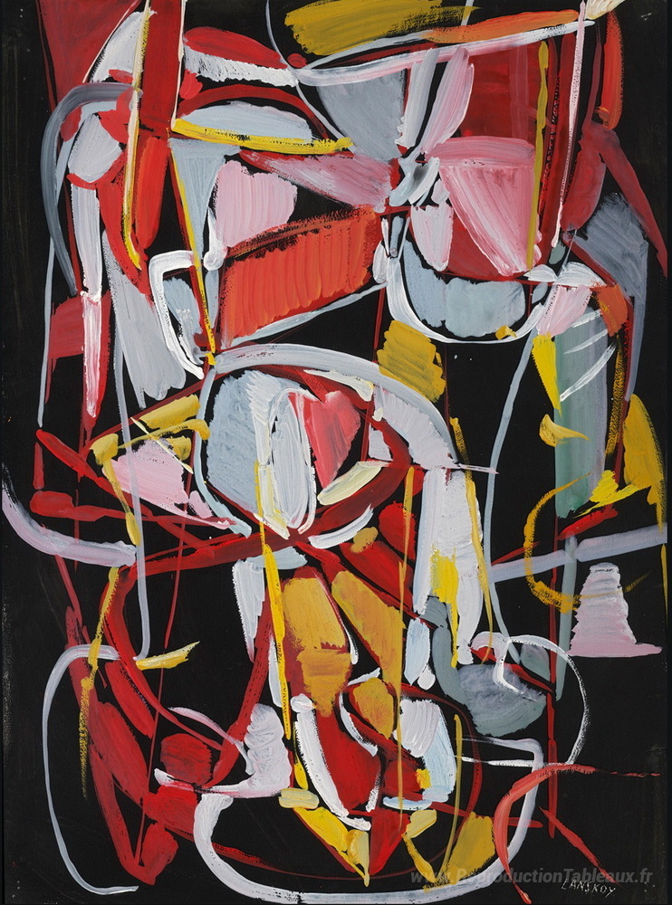 Nous vous proposons une reproduction artisanale sur toile du célèbre tableau 'Composition sur Rouge et noir' de Andre Lanskoy, provenant du Musée de la Reproduction.