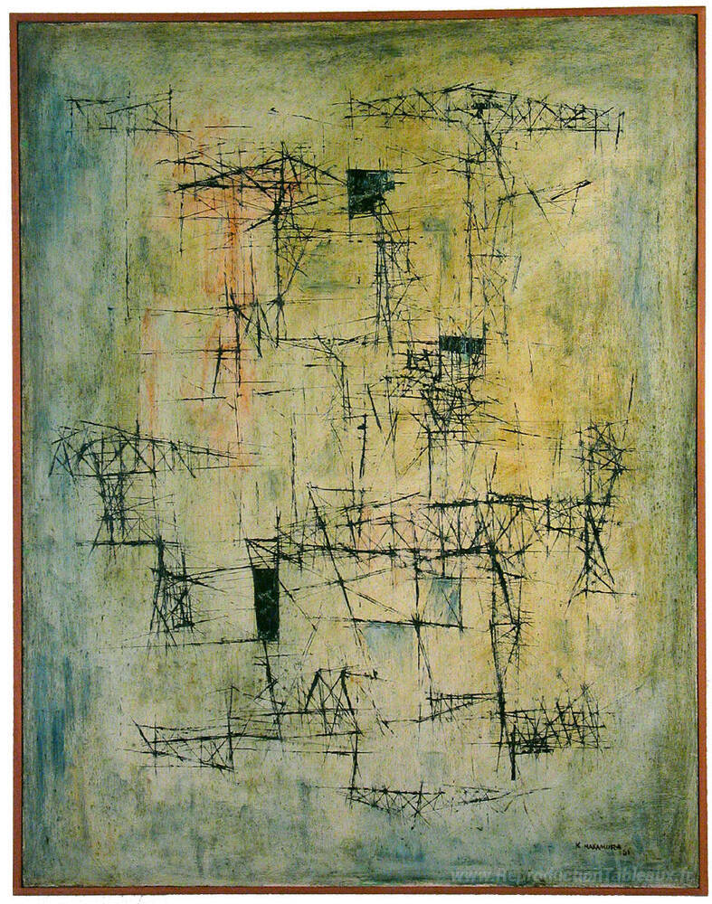 Nous vous proposons une reproduction artisanale sur toile du célèbre tableau 'Composizione 10-51' de Kazuo Nakamura, provenant du Musée de la Reproduction.