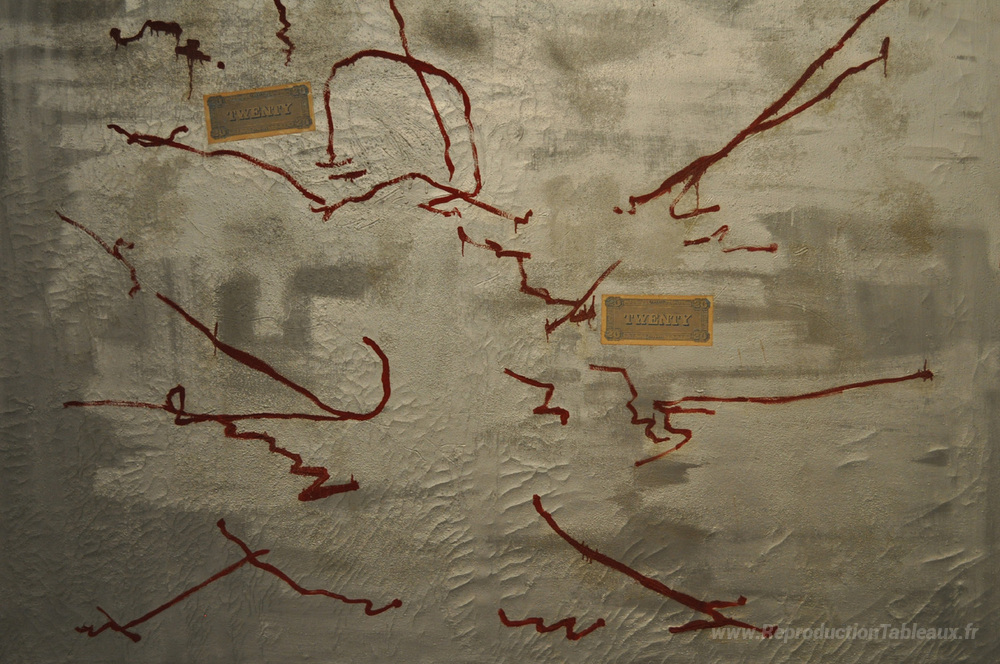 Nous vous proposons une reproduction artisanale sur toile du célèbre tableau 'Composizione argento con Dollaro' de Giulio Turcato, provenant du Musée de la Reproduction.