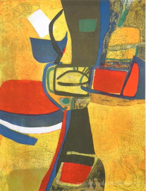Nous vous proposons une reproduction artisanale sur toile du célèbre tableau 'Corne un licou' de Maurice Esteve, provenant du Musée de la Reproduction.