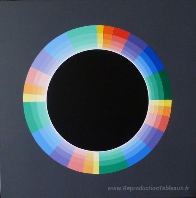 Nous vous proposons une reproduction artisanale sur toile du célèbre tableau 'Couleur électrique lumière' de Horacio Garcia-Rossi, provenant du Musée de la Reproduction.