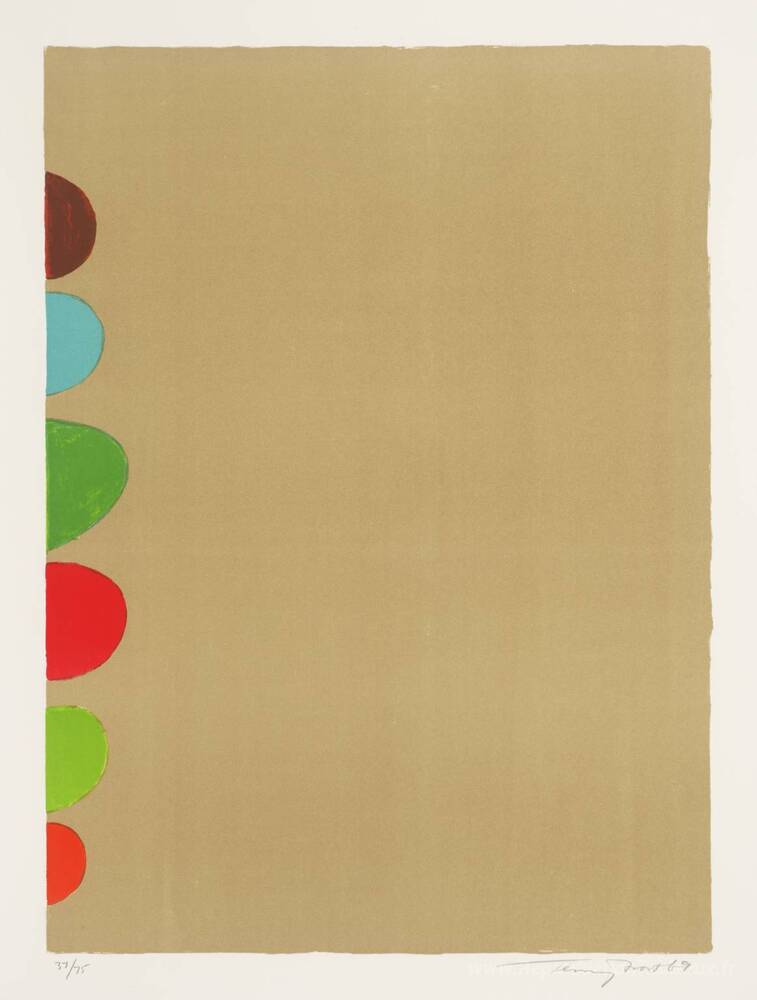 Nous vous proposons une reproduction artisanale sur toile du célèbre tableau 'Couleur sur le côté' de Terry Frost, provenant du Musée de la Reproduction.