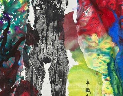 Nous vous proposons une reproduction artisanale sur toile du célèbre tableau 'Crash de la bouteille de nyotaku' de Shozo Shimamoto, provenant du Musée de la Reproduction.
