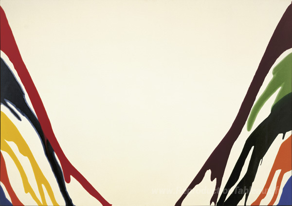 Nous vous proposons une reproduction artisanale sur toile du célèbre tableau 'Delta Kappa' de Morris Louis, provenant du Musée de la Reproduction.