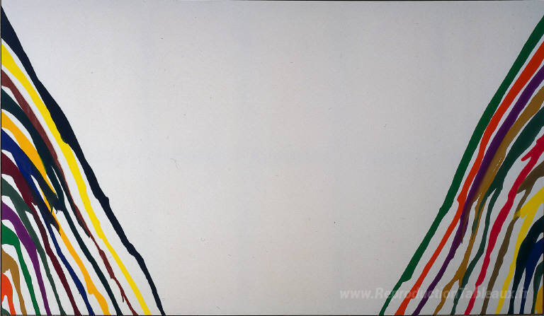 Nous vous proposons une reproduction artisanale sur toile du célèbre tableau 'Delta Lambda' de Morris Louis, provenant du Musée de la Reproduction.