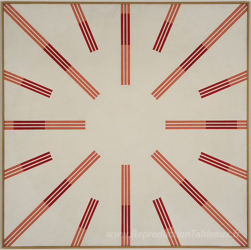 Nous vous proposons une reproduction artisanale sur toile du célèbre tableau 'Effetti indotti di Contrasto e di Assimilazione di tonalità comp' de Mario Ballocco, provenant du Musée de la Reproduction.