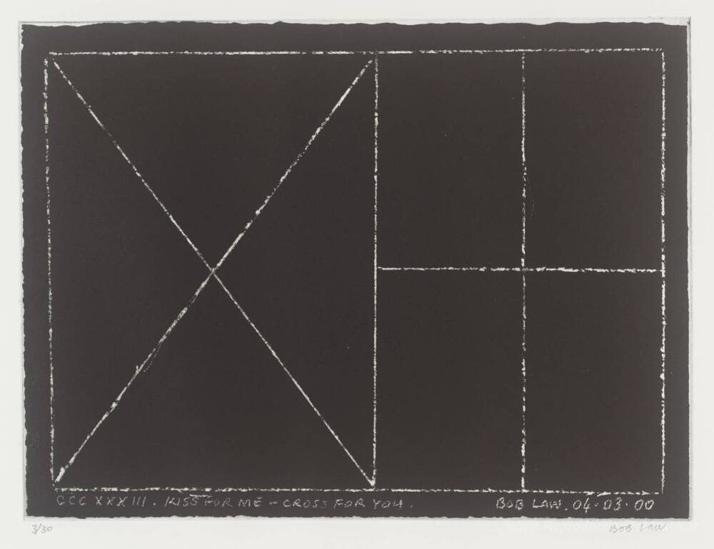 Nous vous proposons une reproduction artisanale sur toile du célèbre tableau 'Embrasse pour moi - croix pour toi' de Bob Law, provenant du Musée de la Reproduction.