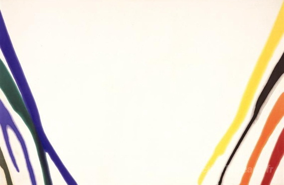 Nous vous proposons une reproduction artisanale sur toile du célèbre tableau 'Gamma Omicron' de Morris Louis, provenant du Musée de la Reproduction.