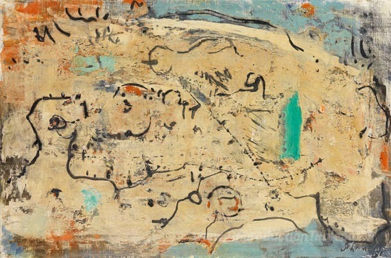 Nous vous proposons une reproduction artisanale sur toile du célèbre tableau 'Grüner Akzent' de Emil Schumacher, provenant du Musée de la Reproduction.