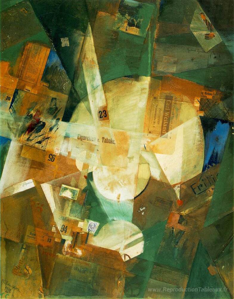 Nous vous proposons une reproduction artisanale sur toile du célèbre tableau 'Image avec centre léger' de Kurt Schwitters, provenant du Musée de la Reproduction.