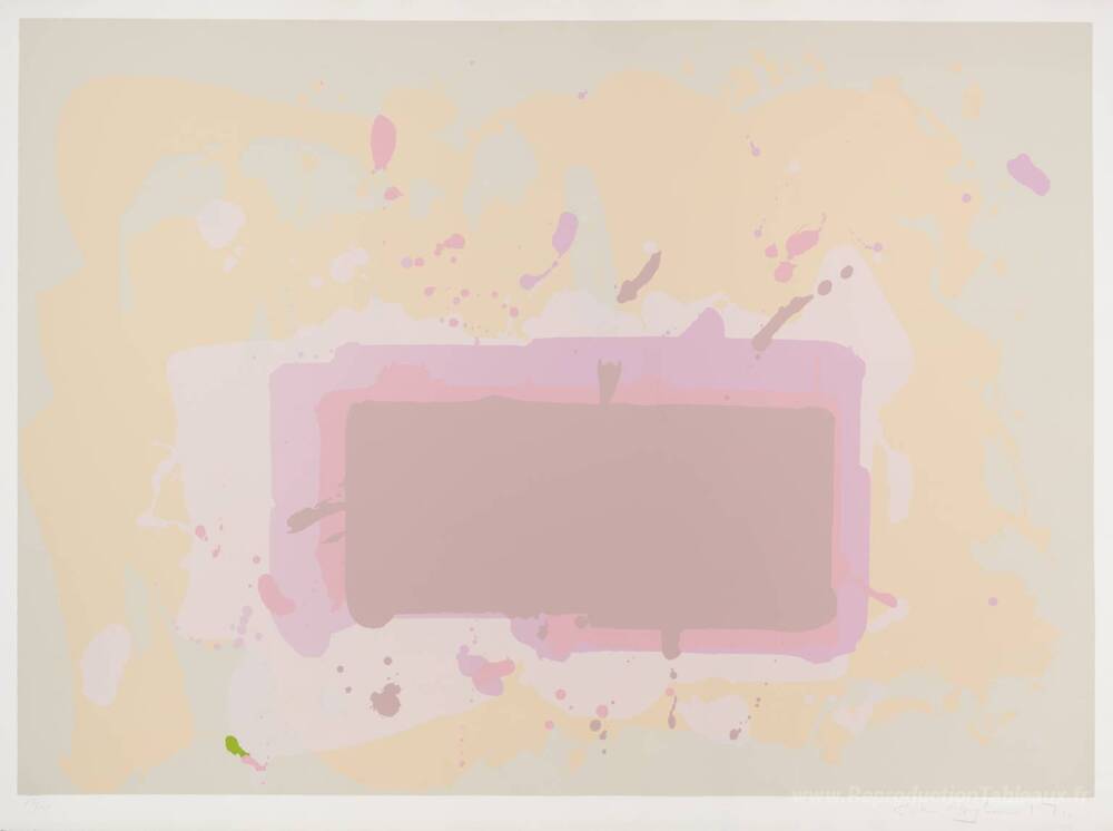 Nous vous proposons une reproduction artisanale sur toile du célèbre tableau 'Jaune pâle, rose et marron' de John Hoyland, provenant du Musée de la Reproduction.