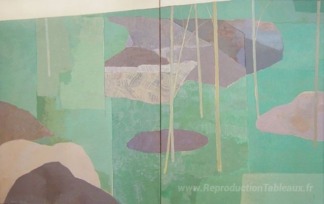 Nous vous proposons une reproduction artisanale sur toile du célèbre tableau 'Jeune bambou (diptyque)' de Kenzo Okada, provenant du Musée de la Reproduction.