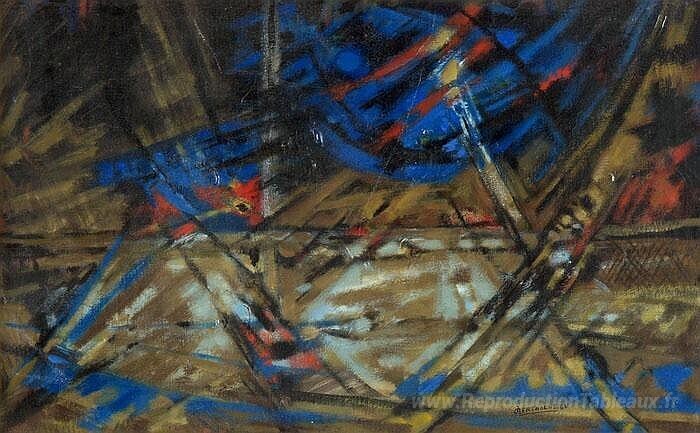 Nous vous proposons une reproduction artisanale sur toile du célèbre tableau 'Komposition à Blau, rot und Braun' de Jean Bertholle, provenant du Musée de la Reproduction.