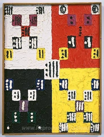 Nous vous proposons une reproduction artisanale sur toile du célèbre tableau 'L'apex n'est rien' de Alfred Jensen, provenant du Musée de la Reproduction.