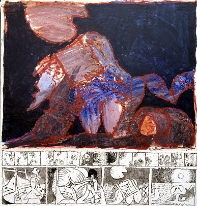Nous vous proposons une reproduction artisanale sur toile du célèbre tableau 'Le Complexe du sphinx' de Pierre Alechinsky, provenant du Musée de la Reproduction.