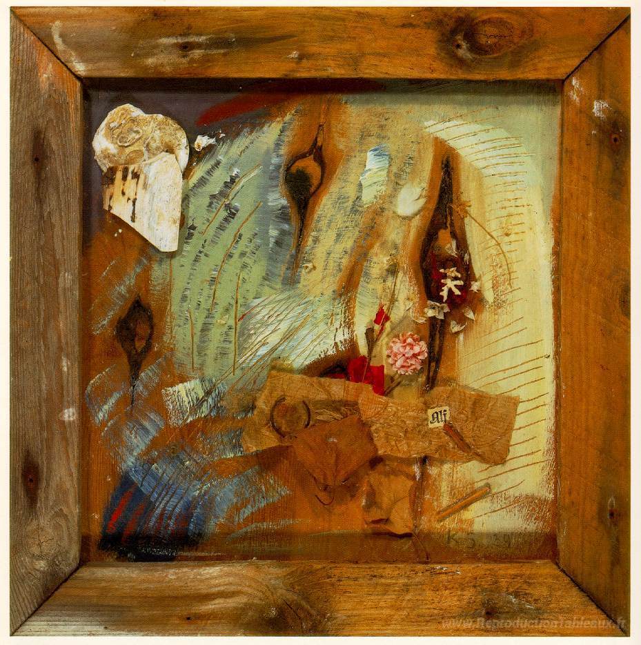 Nous vous proposons une reproduction artisanale sur toile du célèbre tableau 'Merzbild Alf' de Kurt Schwitters, provenant du Musée de la Reproduction.