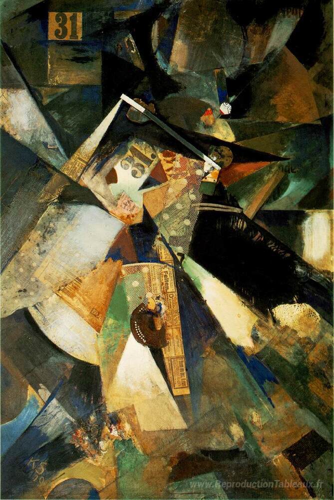 Nous vous proposons une reproduction artisanale sur toile du célèbre tableau 'Merzpicture trente et un' de Kurt Schwitters, provenant du Musée de la Reproduction.