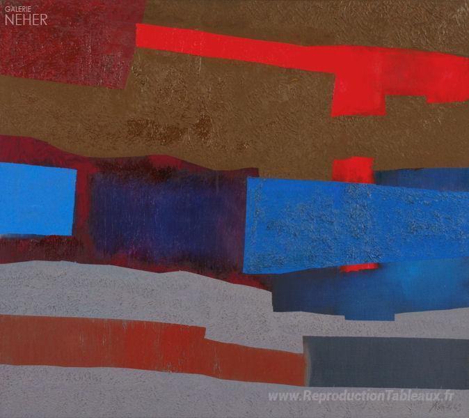 Nous vous proposons une reproduction artisanale sur toile du célèbre tableau 'Mit Rot' de Fritz Winter, provenant du Musée de la Reproduction.