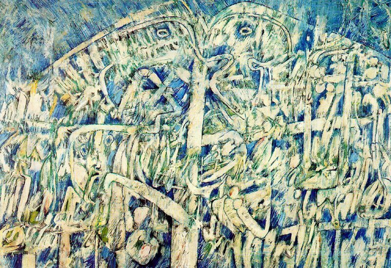 Nous vous proposons une reproduction artisanale sur toile du célèbre tableau 'Montagne' de Pierre Alechinsky, provenant du Musée de la Reproduction.