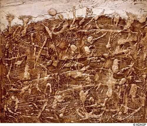 Nous vous proposons une reproduction artisanale sur toile du célèbre tableau 'Moonrise dans les fantômes' de Jean Dubuffet, provenant du Musée de la Reproduction.