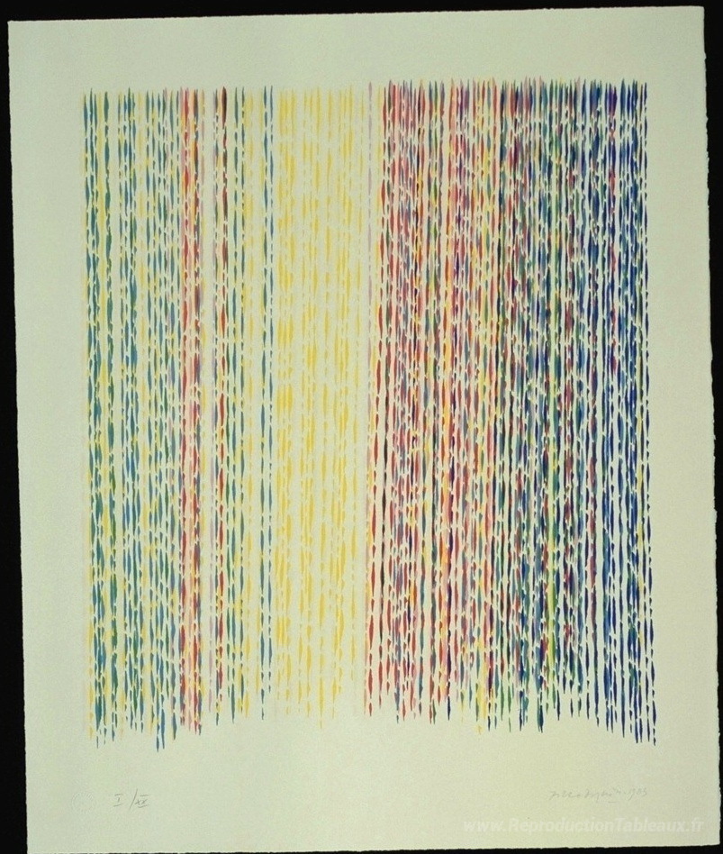 Nous vous proposons une reproduction artisanale sur toile du célèbre tableau 'Paplito della Luce' de Piero Dorazio, provenant du Musée de la Reproduction.