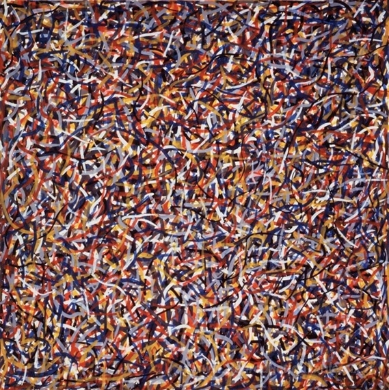 Nous vous proposons une reproduction artisanale sur toile du célèbre tableau 'Pas des coups de pinceau droits dans toutes les directions' de Sol LeWitt, provenant du Musée de la Reproduction.