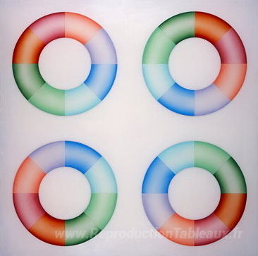 Nous vous proposons une reproduction artisanale sur toile du célèbre tableau 'Pasadena Lifesavers Red Series # 2' de Judy Chicago, provenant du Musée de la Reproduction.