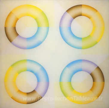 Nous vous proposons une reproduction artisanale sur toile du célèbre tableau 'Pasadena Lifesavers Yellow Series # 2' de Judy Chicago, provenant du Musée de la Reproduction.