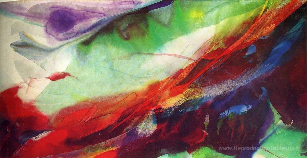 Nous vous proposons une reproduction artisanale sur toile du célèbre tableau 'Phénomènes soleil sur le verre d'heure' de Paul Jenkins, provenant du Musée de la Reproduction.