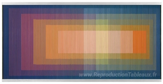 Nous vous proposons une reproduction artisanale sur toile du célèbre tableau 'Physichromie 625' de Carlos Cruz-Diez, provenant du Musée de la Reproduction.