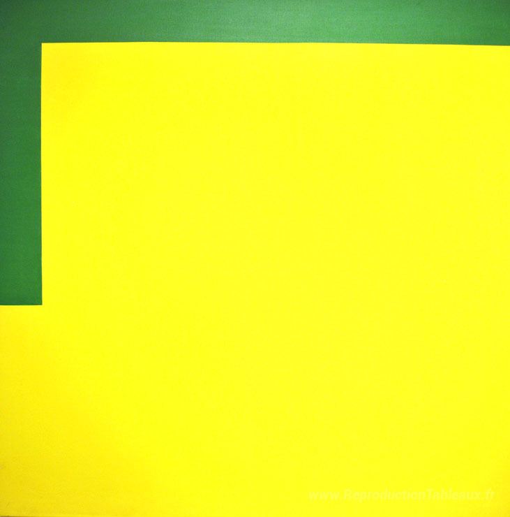 Nous vous proposons une reproduction artisanale sur toile du célèbre tableau 'Plus jaune, moins vert' de Carmen Herrera, provenant du Musée de la Reproduction.