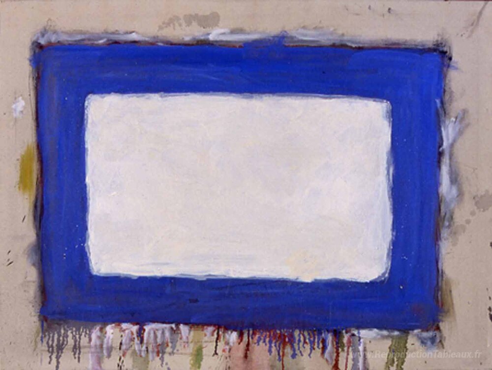 Nous vous proposons une reproduction artisanale sur toile du célèbre tableau 'Rectangle bleu II' de Gene Davis, provenant du Musée de la Reproduction.