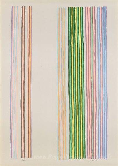 Nous vous proposons une reproduction artisanale sur toile du célèbre tableau 'Rideau royal' de Gene Davis, provenant du Musée de la Reproduction.