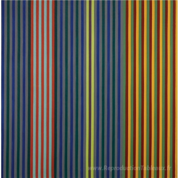 Nous vous proposons une reproduction artisanale sur toile du célèbre tableau 'Rythme partagé' de Gene Davis, provenant du Musée de la Reproduction.