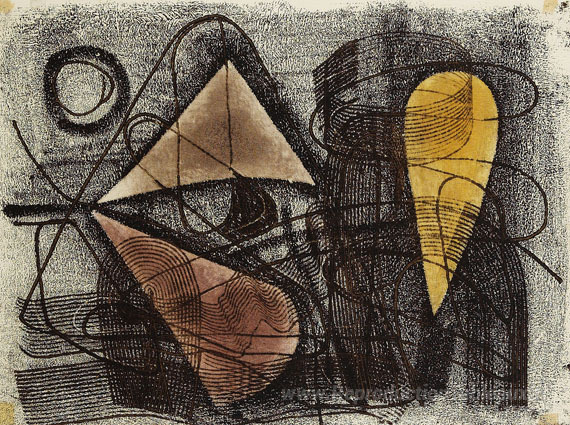 Nous vous proposons une reproduction artisanale sur toile du célèbre tableau 'Sans titre' de Fritz Winter, provenant du Musée de la Reproduction.
