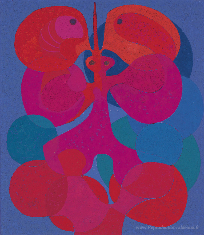 Nous vous proposons une reproduction artisanale sur toile du célèbre tableau 'Sans titre' de Pedro Coronel, provenant du Musée de la Reproduction.