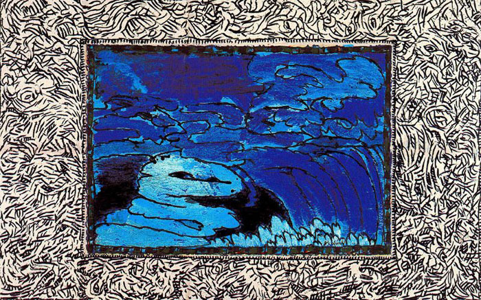 Nous vous proposons une reproduction artisanale sur toile du célèbre tableau 'Taste de l'abîme' de Pierre Alechinsky, provenant du Musée de la Reproduction.