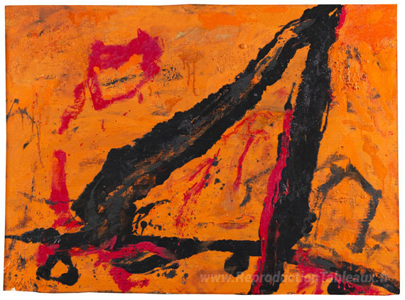 Nous vous proposons une reproduction artisanale sur toile du célèbre tableau 'Timra' de Emil Schumacher, provenant du Musée de la Reproduction.